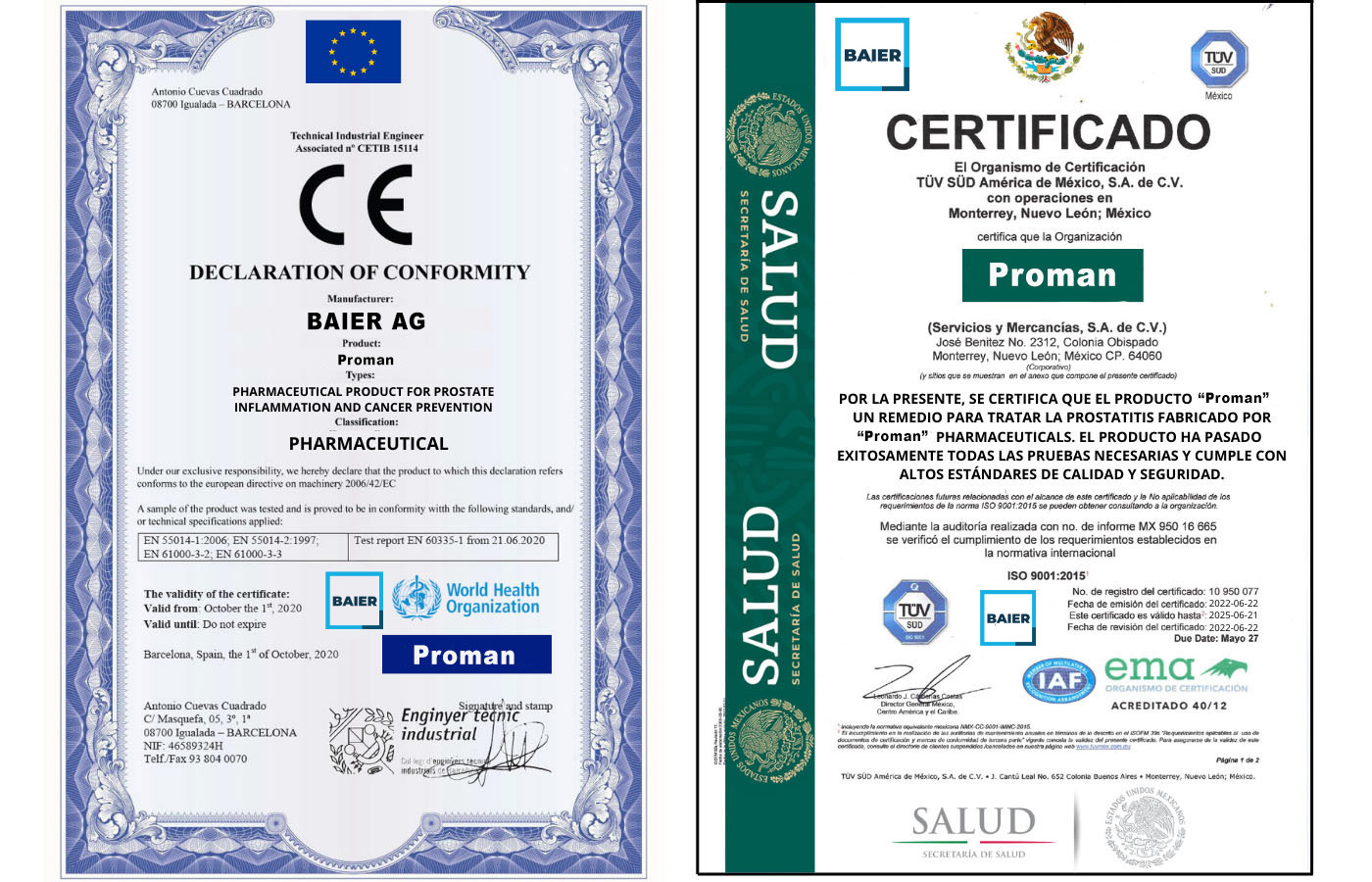 Proman एक विश्वसनीय विकल्प है और इन दो प्रमाणनों द्वारा समर्थित है, जिससे प्रोस्टेटाइटिस के प्रभावी उपचार की खोज करने वाले मरीजों को शांति मिलती है।